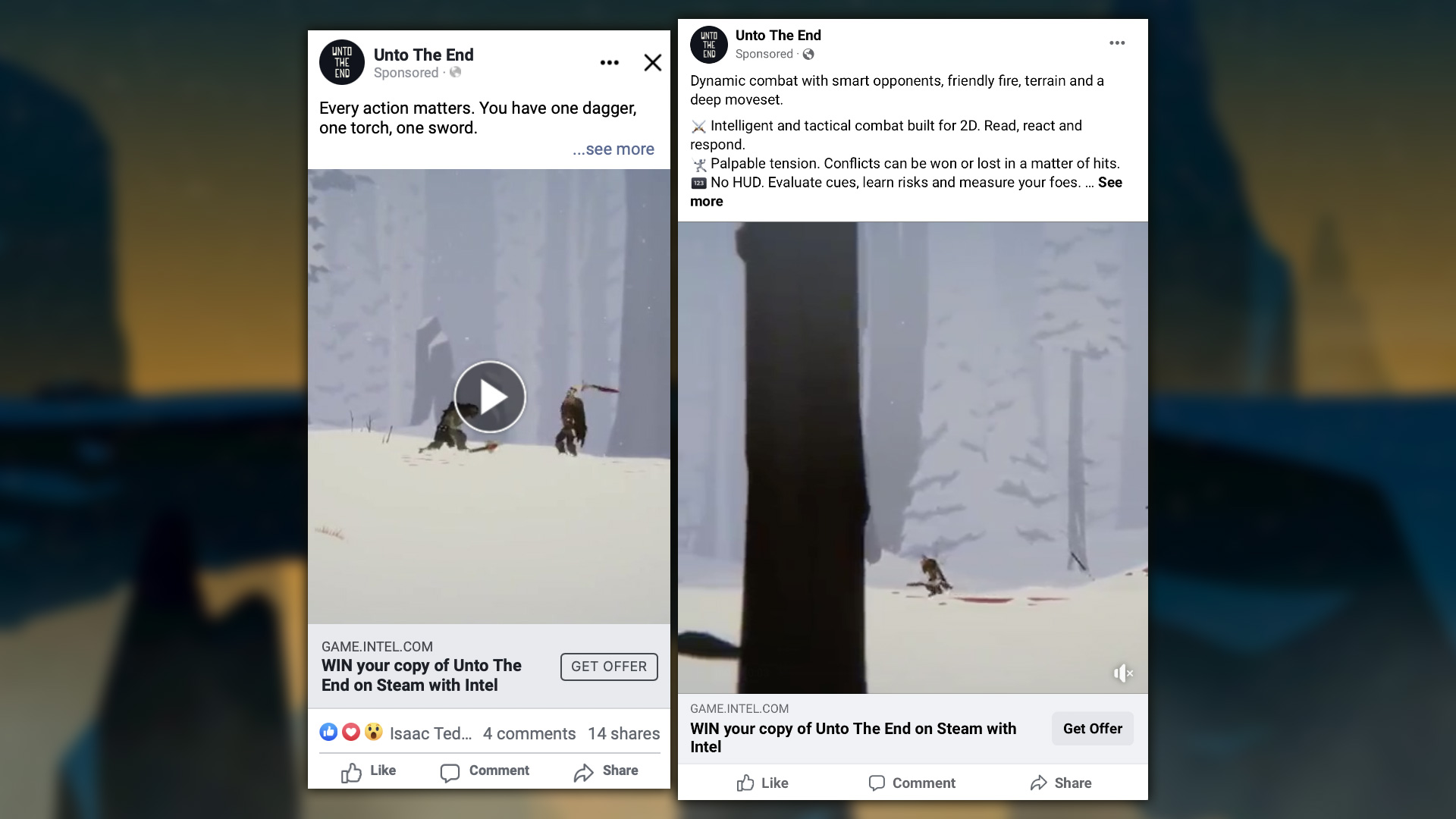We worked with Intel to run a giveaway for a limited number of game keys. We focused advertising around wide indie gamers, and players of similar ‘brutal’ style games like Dark Souls or Salt and Sanctuary. This resulted in 5,114 clicks from a $1,000 spend and a CPC of $0.19.