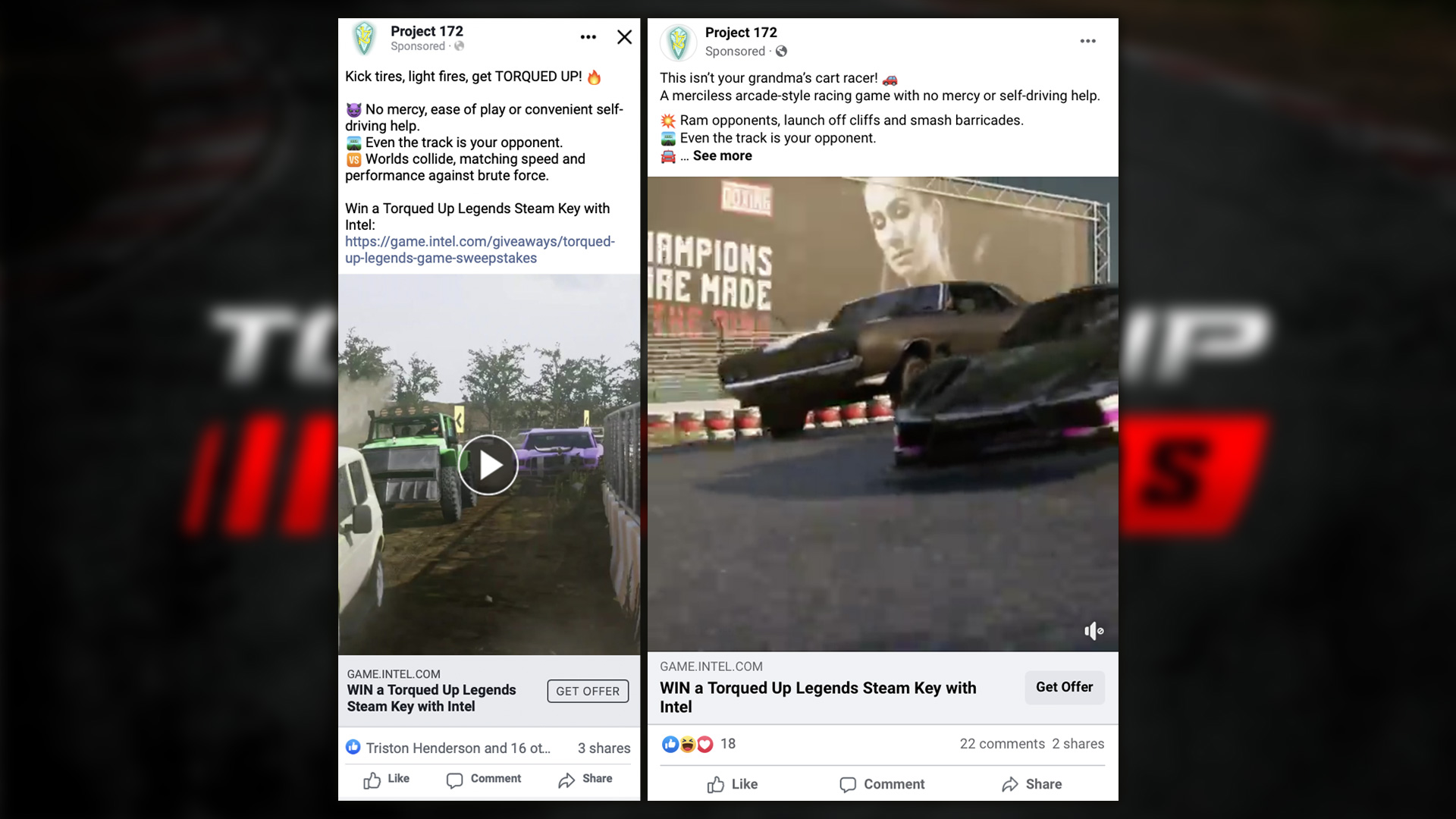 We created an early access campaign for the game and drove a large number of arcade racing fans toward a giveaway in collaboration with Intel. This resulted in 34,008 clicks from $4,000 spend for a CPC of $0.12.